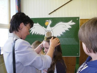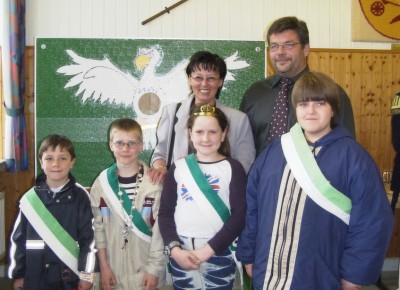 Von Links nach Rechts: Marius Handke (Apfel);Daniel Lakmann (König und Zepter); Siegerin Kinderkönigin Lisa Nolte; Sahra Sagenschneider (Krone)